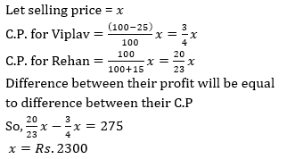 Q1. Viplav calculates his profit percentage on the selling price whereas Rehan calculates his profit on the cost price. They find that the difference of their profits is Rs. 275. If the selling price for both of them is same, and Viplav gets 25% profit and Rehan gets 15% profit, then find their selling price.