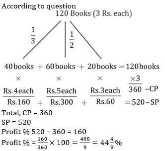 Q5. A book seller purchased 120 exercise books at the rate of Rs. 3 each and sold 1/3 of them at the rate of Rs. 4 each, ½ of them at the rate of Rs. 5 each and the rest at the cost price. Then find the total profit percent of book seller?