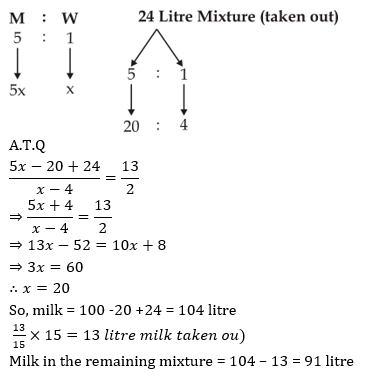 Q10. In a vessel there is a certain quantity of mixture of milk and water in the ratio 5 : 1 respectively. 24 litres of mixture is taken out and same quantity of milk is added to the vessel. The ratio of milk and water now becomes 13 : 2 respectively. Again 15 litres of mixture is taken out. What is the quantity of milk in the resulting mixture? (in litres)