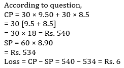 Q4. Nikita bought 30 kg of wheat at the rate of Rs. 9.50 per kg and the same amount of another type of wheat at the rate of Rs. 8.50 per kg and mixed them. She sold the mixture at the rate of Rs. 8.90 per kg. Her total profit or loss in the transaction was: