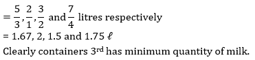 Q6. The ratio of milk and water in mixture of four containers are 5 : 3, 2 : 1, 3 : 2 and 7 : 4 respectively. In which container is the quantity of milk relative to water is minimum ?