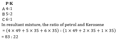 Q9. What will be the ratio of petrol and kerosene in the final solution formed by mixing petrol and kerosene that are present in three same capacity of vessels in the ratio 4 : 1, 5 : 2 and 6 : 1 respectively ?