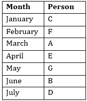 Seven persons A, B, C, D, E, F and G are going for seven days holiday on different months of same year i.e. January, February, March, April, May, June and July. All information is not necessarily in same order.