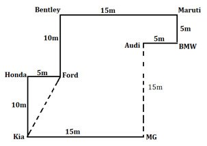 Eight cars i.e. Ford, Honda, BMW, MG, Audi, Kia, Maruti and Bentley are parked in a parking in a certain way. Honda is 5m west of Ford. Bentley is 10m north of Ford. Kia is 15m west of MG. Audi is 5m west of BMW which is 5m south of Maruti. Honda is 10m north of Kia. Bentley is 15m west of Maruti.