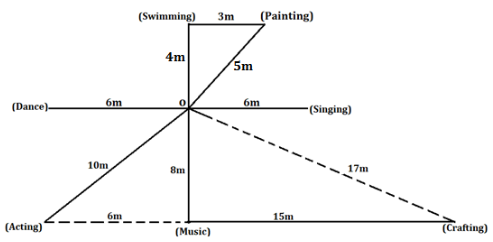 The person who teach dance goes 6m in west direction from point O. The person who teach Painting goes 5m in Northeast direction from point O. The person who teach Swimming goes 4m in North direction from point O. The person who teaches Singing goes 6m in East direction from point O. The person who teaches Music goes 8m in south direction from point O. The person who teaches Acting goes 10m in Southwest direction from point O.