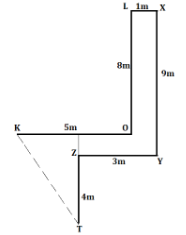 Dheeraj started his journey from point K, he walks 5m in the east direction to reach point O, after that he turns left and walks 8m to reach at point L. From point L, he turns to his right and walks 1m to reach at point X. From point X he walks 9m south to reach point Y. Now he take right turn and walks 3m to reach point Z. from point Z he takes a left turn and walks 4m to reach point T.