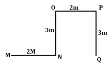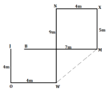 Rakesh starts his journey from point B, walks 7m towards East to reached at point M, then takes a Left turn and walks for 5m to reach point X. From point X he takes a left turn and walks for 4m to reach at point N, From point N he walks 9m south direction to reach at point W, then takes a right turn again and walks 4m to reach point O. From point O, He walks 4m in north direction and reached point J.