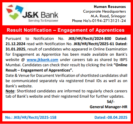 The release of the JK Bank Apprentice Result 2025 has brought clarity to the candidates who appeared in the exam. Only those candidates who have secured marks equal to or more than the specified cut-off will be called for the Document Verification process. The bank has clarified that the date and venue for document verification will be shared separately via the candidates’ registered email IDs and also published on the official website.