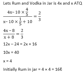 Q9. A jar contains mixture of Rum and Vodka in the ratio of 4 : 1, when 10ℓ of mixture taken out and same amount of Vodka poured into jar the ratio becomes 2 : 3 then find how many liters of Rum was contained in Jar initially ?