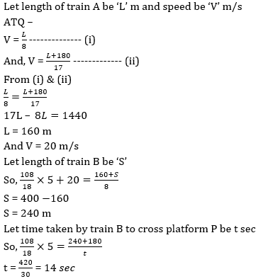 Q12. Train A can cross a man in 8 sec and a 180 m long platform ‘P’ in 17 sec. If train A cross train B which is running in opposite direction at speed of 108 km/hr in 8 sec, then find time taken by train B to cross platform P?