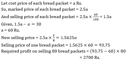 Q13. ‘X’ is a bread seller who marked up price of each bread packet by 150% above and allow discounts of 40% and made a profit of Rs. 30 on each bread packet. If ‘X’ allows 37.5% discount on each packet, then find how much profit he gets on selling 80 bread packets?