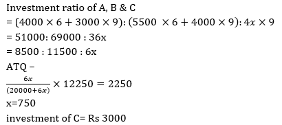 Q11. A and B entered in a business by making investment of Rs. 4000 & Rs. 5500 respectively. After six months A & B withdrew Rs. 1000 and Rs. 1500 respectively and C joined them with capital of Rs. 4x. If after one year and three months C received Rs. 2250 as profit share out of total profit of Rs. 12250, then find investment of C?