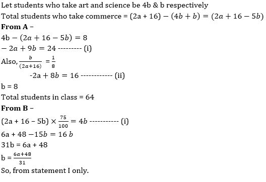 Q10. There is (2a+ 16) students in a class with three streams, i.e. art, science & commerce. The ratio of students who take art to science is 4 : 1. Find total number of students in class.