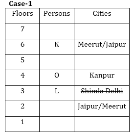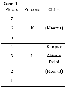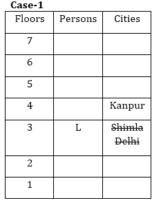 Step-1:- L sits on one of the odd number floors below the floor number 4. The person who lives on 4th floor belongs to Kanpur and L does not belong to Shimla and Delhi. There should be two possible cases-