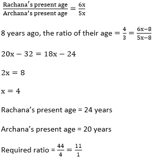 Q10. 8 years ago, the ratio of the ages of Ruchi and Arohi was 4 : 3. If the ratio of their present ages is 6 : 5 respectively, what is the ratio of the sum and difference of their present ages?