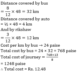 Q10. In a journey of 48 km travelled by bus, auto and rikshaw in that order, the distance covered by the three ways is in the ratio of 8 : 1 : 3 respectively and charges per kilometer in that order are in the ratio of 8 : 1 : 4 respectively. If the bus charges being 24 paise per kilometer, the total cost of the journey is: