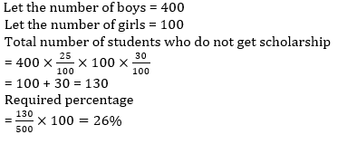 Q7. The ratio of the number of boys to that of girls in a school is 4 : 1. If 75% of boys and 70% of the girls are scholarship holders, then the percentage of students who do not get scholarship is :