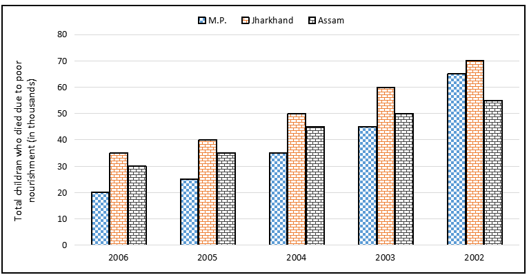 Directions (11-15): The following bar graph shows the total no. Of children from three states of India who were died due to poor nourishment in five different year. Study the graph carefully to answer the following questions.