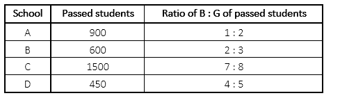 Q14. If the difference between the failed boys to girls is 25 in school D. Find the ratio of passed to failed students from D.
