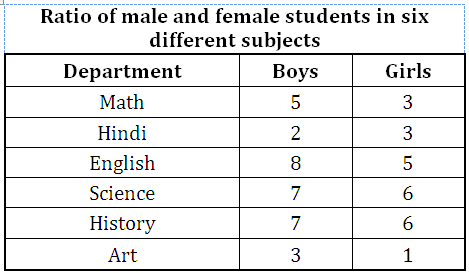 Q11. Find the ratio of the total number of boys studying in Math, Hindi and Art to the girls in same subjects?