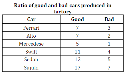 Q11. Find the ratio of the total number of good cars of the companies Alto, Swift and Sedan together to the total number of bad cars of the companies Ferrari, Mercedese and Sujuki together?