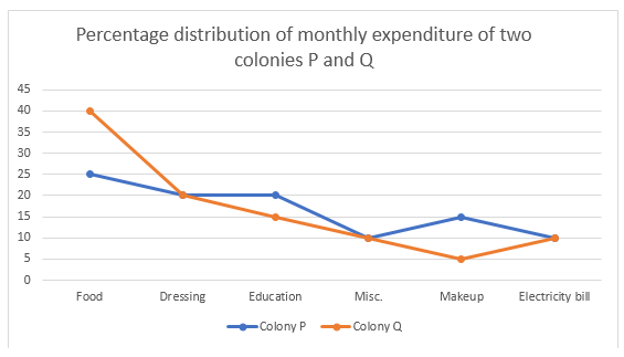 Directions (6–10): Following bar diagram shows the monthly expenditure of two colonies i.e. P and Q on food, dressing, education, make up, electricity bill and miscellaneous (in percentage).