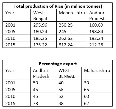Directions (6 – 10): Given below are the tables showing total production of Rice (in million tonnes) and the percentage export from total production by three states (Maharashtra, Andhra Pradesh and West Bengal) individually for four different years. Read the following tables carefully and answer the following Tables carefully and answer the following questions.