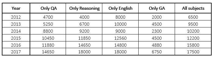 Directions (1-5): The following table shows the no. of students joined coaching classes for four individual subjects and a class for all combined subject in Career Power classes in Delhi region over six years. Read the question given below and answer accordingly.