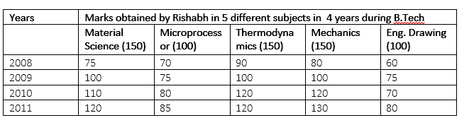 Directions (11-15): Table shows the marks obtained by Rishabh in five different subjects in 4 different years. Study the following table to answer the questions that follows: