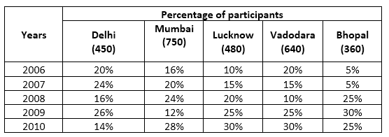 Q5. If in 2005, the no. of selected participants from Delhi and Mumbai were 20% and 40% less than that in 2006 respectively then find the difference between selected participants of Delhi and Mumbai in the year 2005?