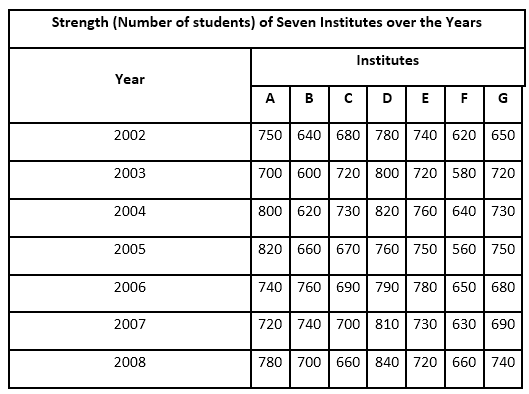 Directions (11-15): Given below is the table which shows the number of students in seven institutes over different years. Study the following table carefully and answer the questions given below it.