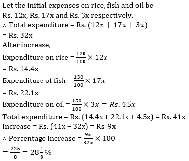 Q8. The expenses on rice, fish and oil of a family are in the ratio 12 : 17 : 3 respectively. The price of these articles is increased by 20%, 30% and 50% respectively. The total expenses increased by: