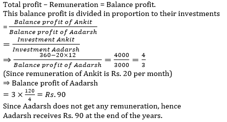 Q5. Ankit and Aadarsh invest Rs. 4000 and Rs. 3000 in a business respectively. Ankit receives Rs. 20 per month out of the profit as a remuneration for running the business and the rest of profit is divided in proportion to the investments. If in a year Ankit totally receives Rs. 360, what does Aadarsh receive?