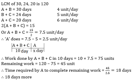 Q19. A and B can do piece of work in 30 days while B and C can do the same work in 24 days and C and A in 20 days. They all work together for 10 days then B and C leave. How many days more will A take to finish the work?