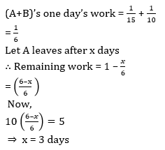 Q16. A and B can do a job in 15 days and 10 days, respectively. They began the work together but A leaves after some days and B finished the remaining job in 5 days. After how many days did A leave?