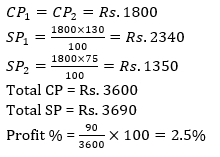 Q9. A man purchases two articles at Rs. 1800 each. While selling in one he gains 30% and on the other he loses 25%. What is his gain or loss percent on the whole transaction?