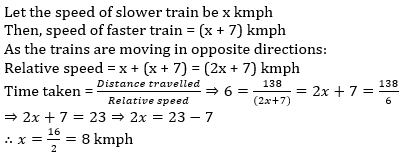 Q4. The distance between two stations A and B is 138 km. A train starts from A towards B and another from B to A at the same time and they meet after 6 hours. The train travelling from A to B is slower by 7 kmph compared to other train from B to A, then find the speed of the slower train?