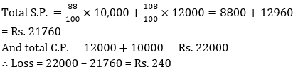 Q4. Raju purchased a mobile phone and a refrigerator for Rs. 12,000 and Rs. 10,000 respectively. He sold the refrigerator at a loss of 12 per cent and the mobile phone at a profit of 8 per cent. What is his overall loss/profit ?