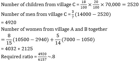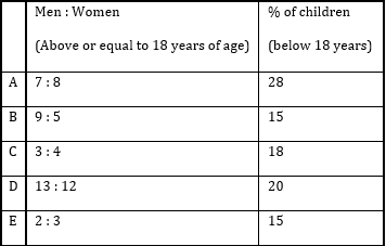 Ratio of men to women and percentage of children in five villages is given in the chart.