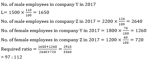 Q13. If the no. of male employees in company Y and Z are increased by 10% and 20% respectively in year 2017 as compared to 2016 and no. of female employees in company Y and Z are decreased by 30% & 40% respectively in 2017 as compared to 2016. Then find ratio of total no. of employees in company Y to company Z in year 2017 ?
