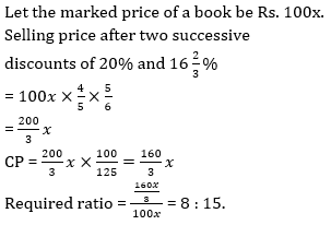Q8. A shopkeeper after allowing two successive discounts of 20% and 16â…”% on the marked price, earns a profit of 25% on selling the book. Find the ratio of cost price to the marked price of a book ?