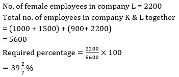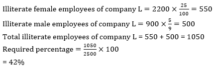Q14. If 25% of the female employees in company L are illiterate and ratio of male literate to (male)illiterate in same company is 4 : 5 then find total illiterate employees in company L is what percent of the total employees of company K?
