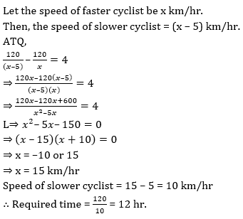 Q9. Two places Aurangabad and Ellora are 120 km apart. Two cyclists leave Ellora for Aurangabad such that second leaves 4 hours after the first. Both the cyclists arrive at Aurangabad at the same time. Find the time taken by the slower cyclist on the trip if the speed of one cyclist is 5 km/hr more than the other.