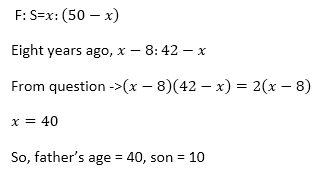 Q5. The sum of the ages of father and son is 50 years. Eight years ago, the product of their ages was two time the father’s age at that time, then the present ages (in years) of the father and son respectively are