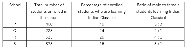 Directions (6-10): Table shows four different schools in which total number of enrolled students in each school is given and percentage of enrolled students who are learning Indian Classical and ratio of male to female students who are learning Indian classical are given. Study the following table carefully and answer the questions given below.