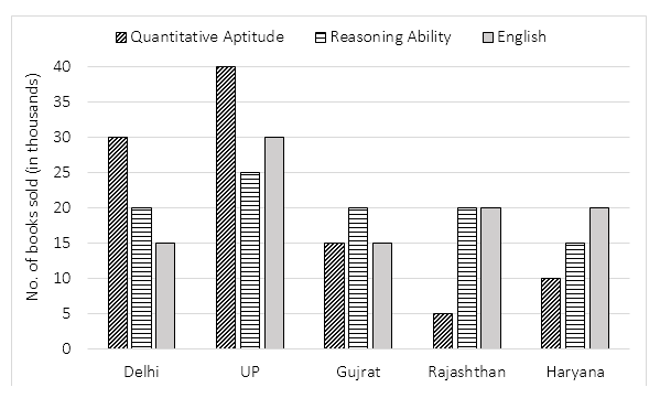 Directions (11-15): The following bar graph shows the number of three types of books viz. Quantitative Aptitude, Reasoning Ability and English sold by Adda247 Publication in five different states of India, in the year 2017. The table shows the profit percentage earned by Adda247 Publication from these five states on the three books given above. Study both the graphs carefully and answer the questions that follow: