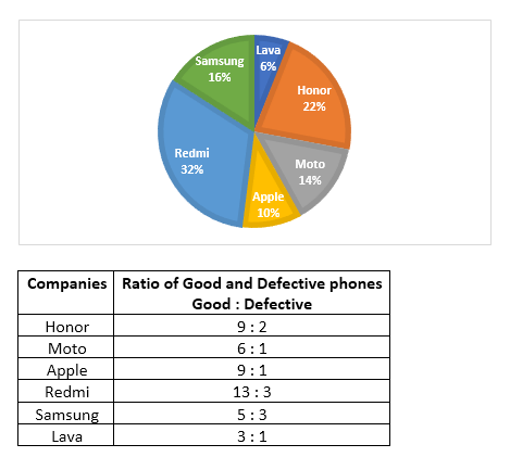 Directions (1-5): The following pie-chart shows the percentage distribution of mobile phones of different companies and table shows the ratio of good and defective phones respectively of different companies in year 2017. Study the graphs carefully to answer the following questions.