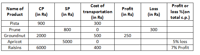 Percentage profit or loss for following dry fruits is based on the sum of cost price and  transportation cost.
