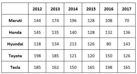 Direction (11-15): – Table given below shows car manufactured by five different companies in six different years. Study the data carefully and answer the following questions–