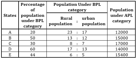 Directions (1-5): Table given below shows population of five states living under BPL Category (in percentage) and under APL category (in absolute value). Ratio between rural population and urban population living under BPL category in five states is also given .Study the data carefully and answer the following questions-